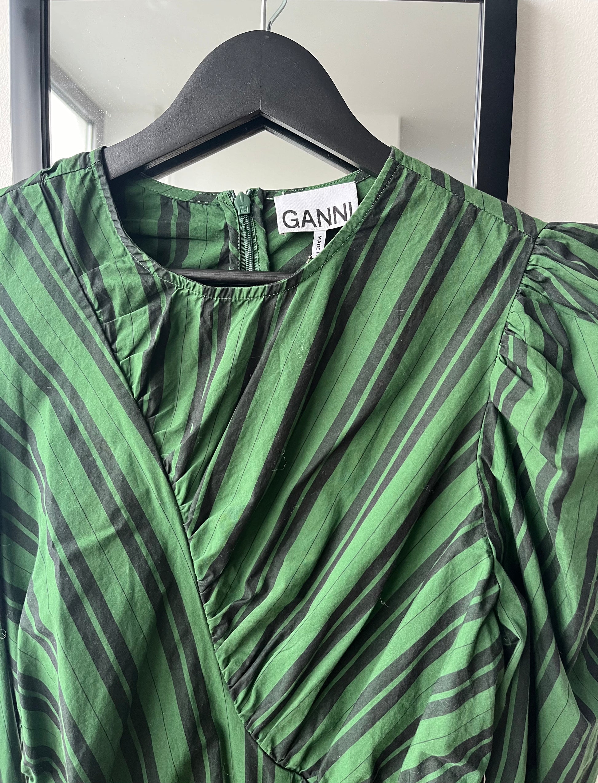 Ganni Green Striped Ruche Midi Dress