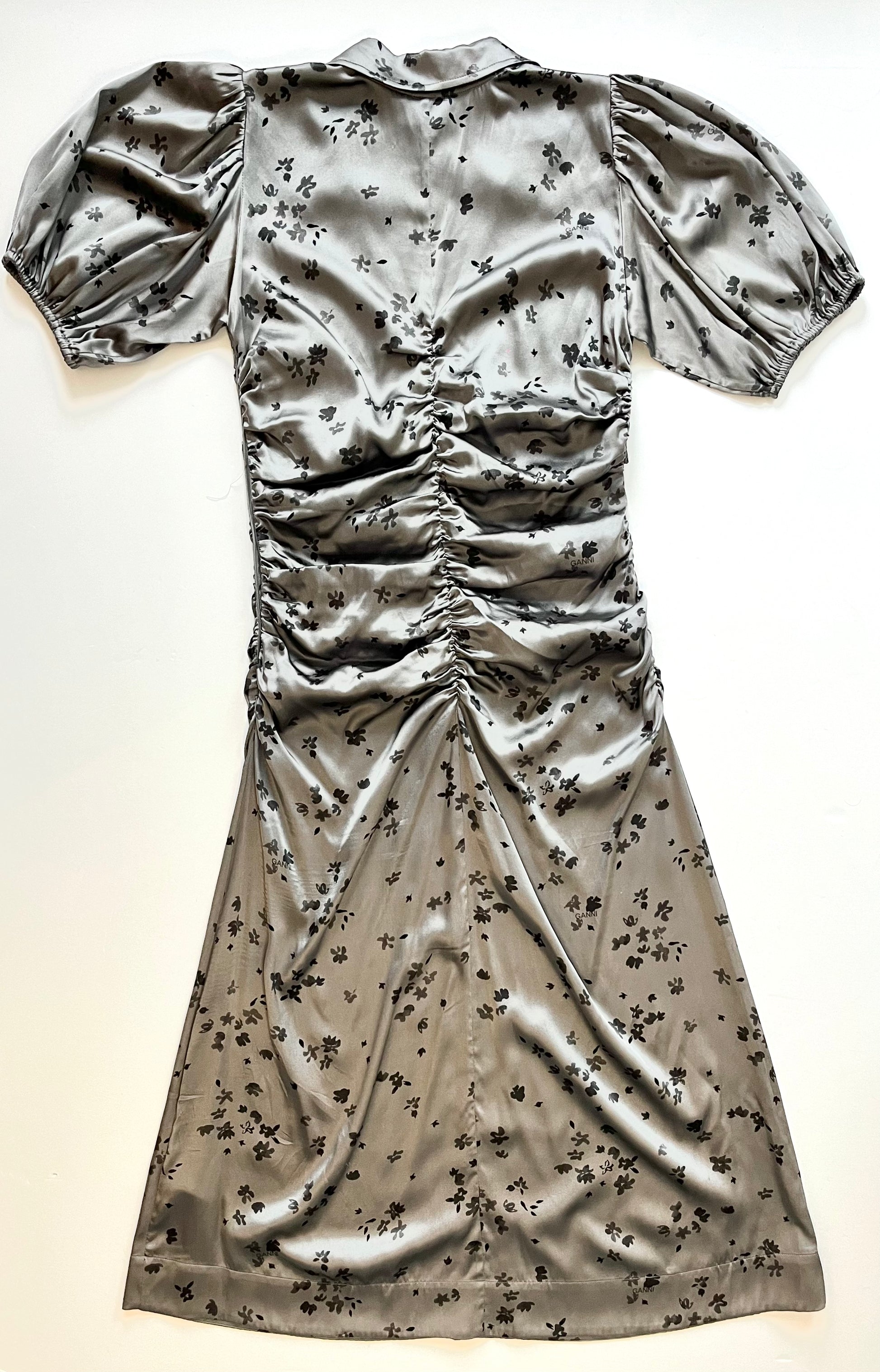 Ganni Grey Satin Silk Floral Midi Dress