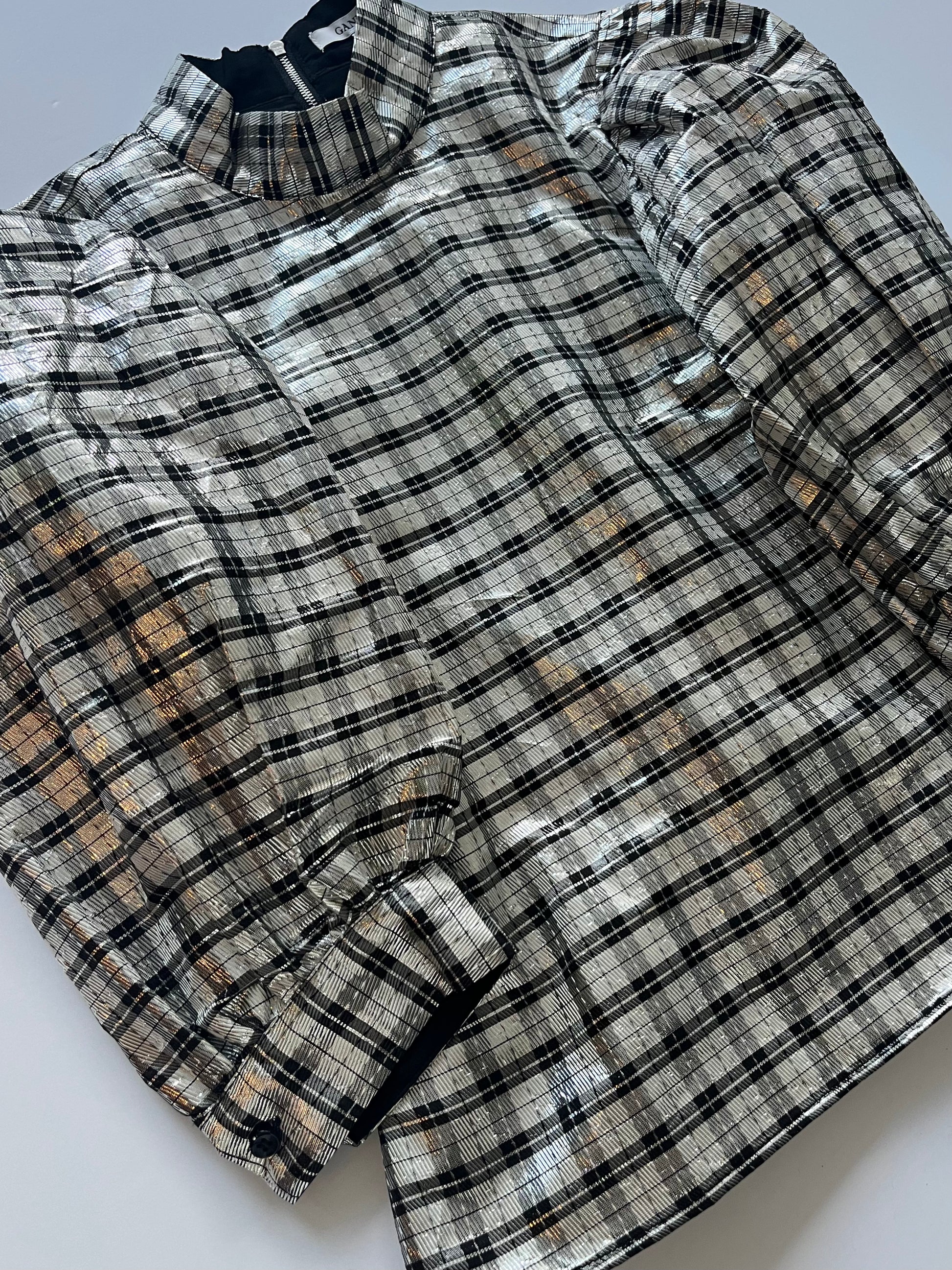 Ganni Silver Lamé Statement Sleeve Top