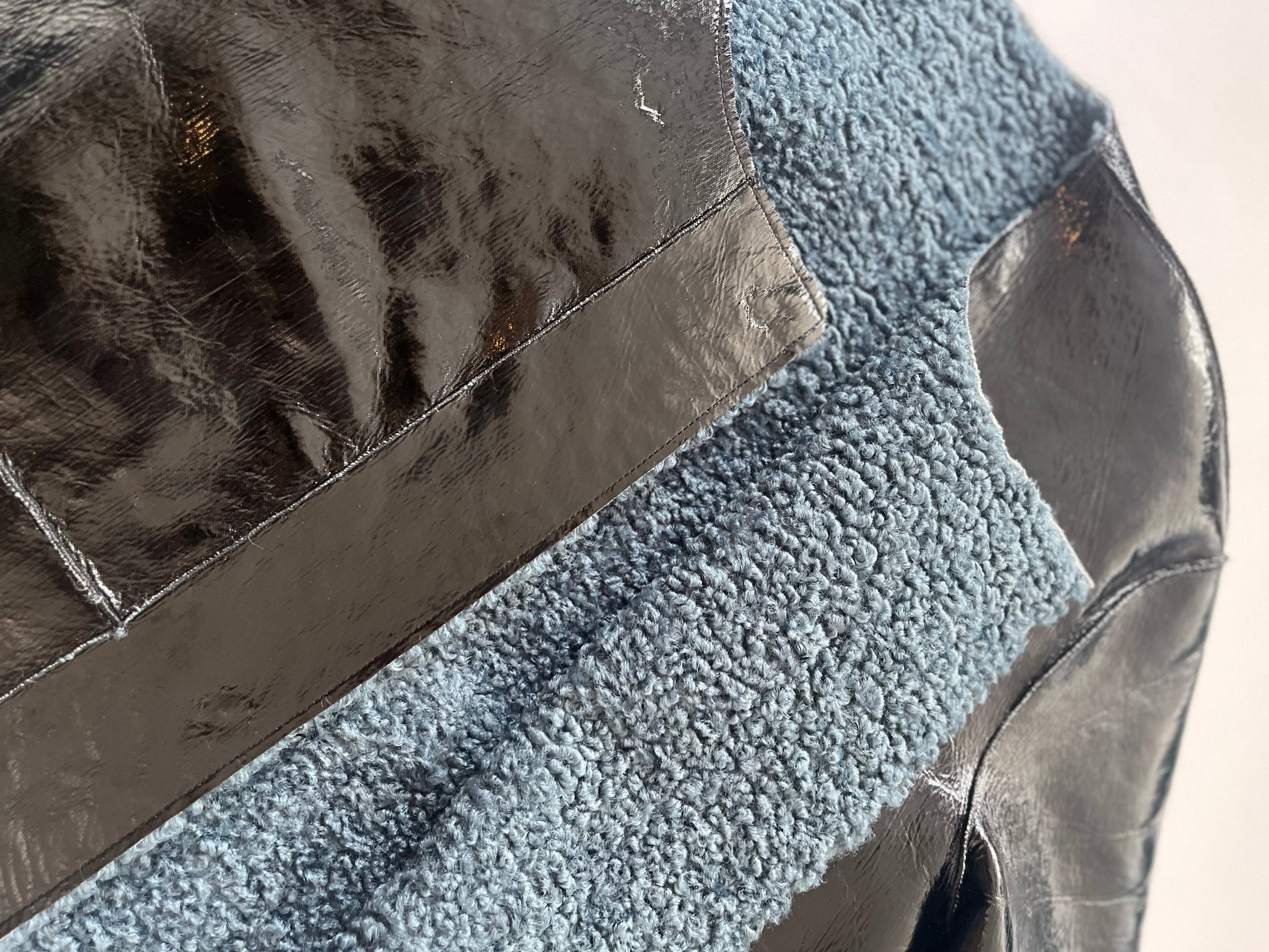 Stand Studio Wet-look Blue Shearling Collarless Jacket. Vegan leather.